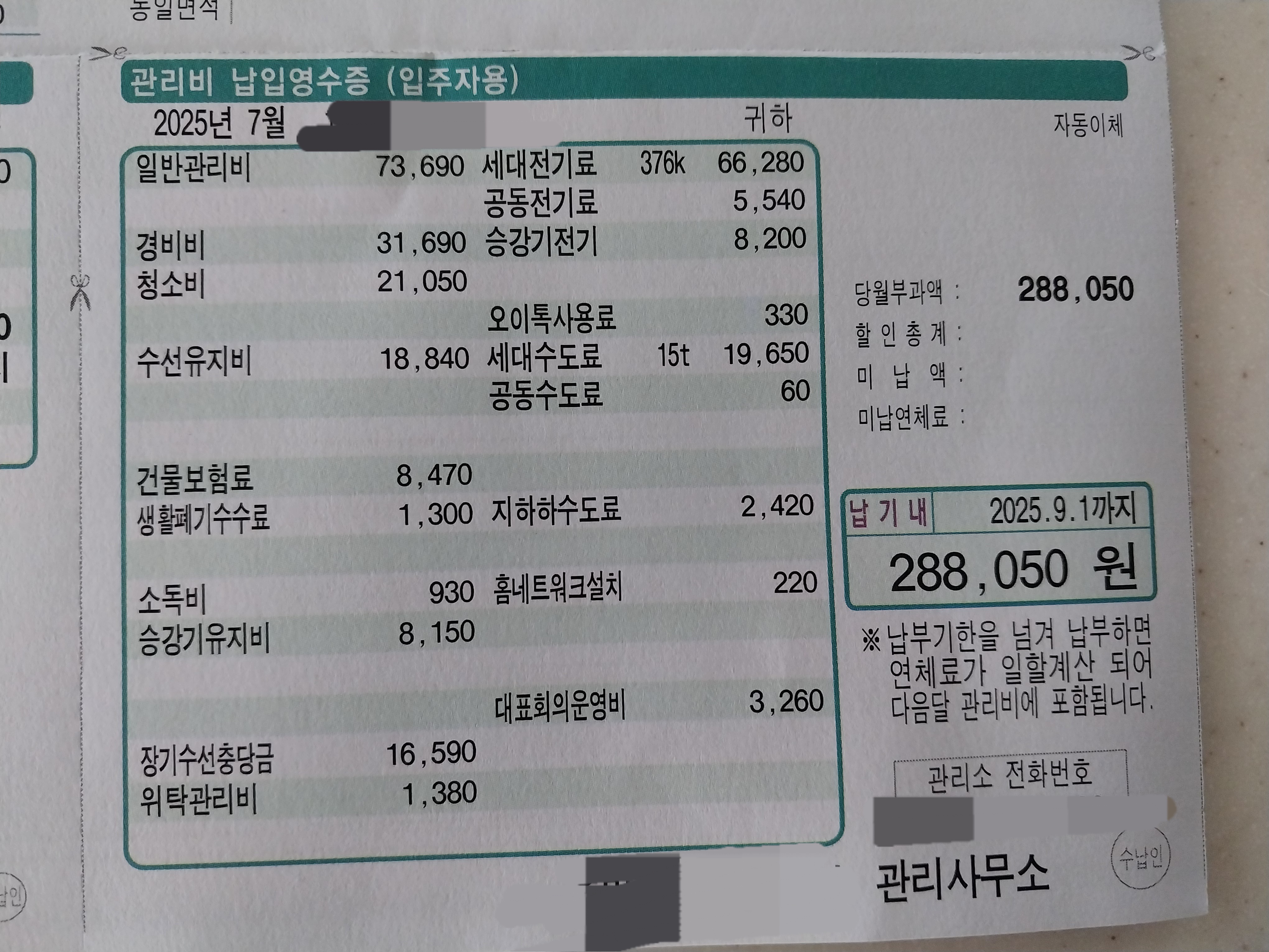 25년 9월분 263,380원 가스비 8,000원