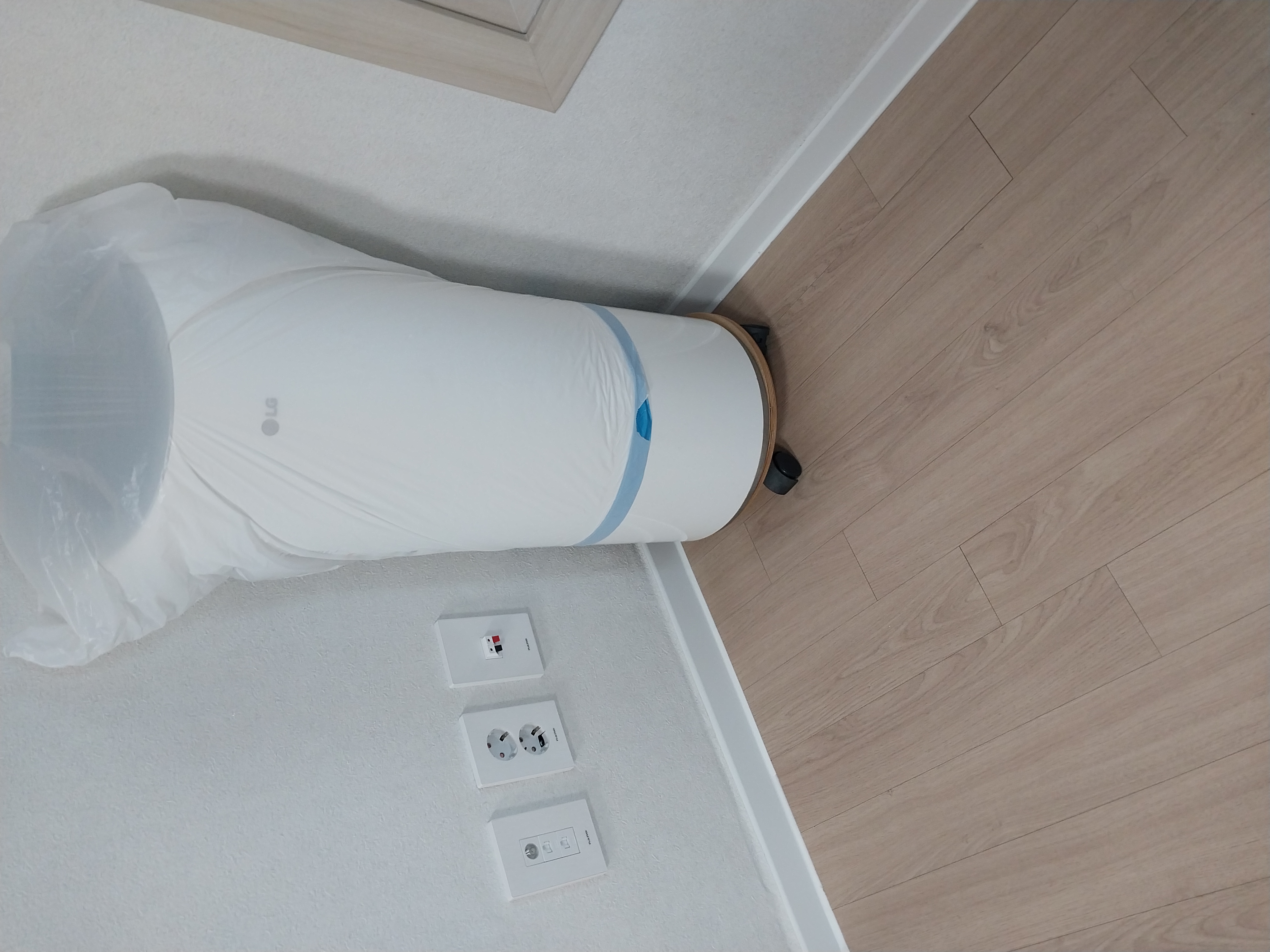 제습기 전원선은 길어서 이렇게 위 아래 2개를 붙여서 해결함. (양면테이프가 살짝 에러라 집에 있는 글루건으로 덧붙임)
