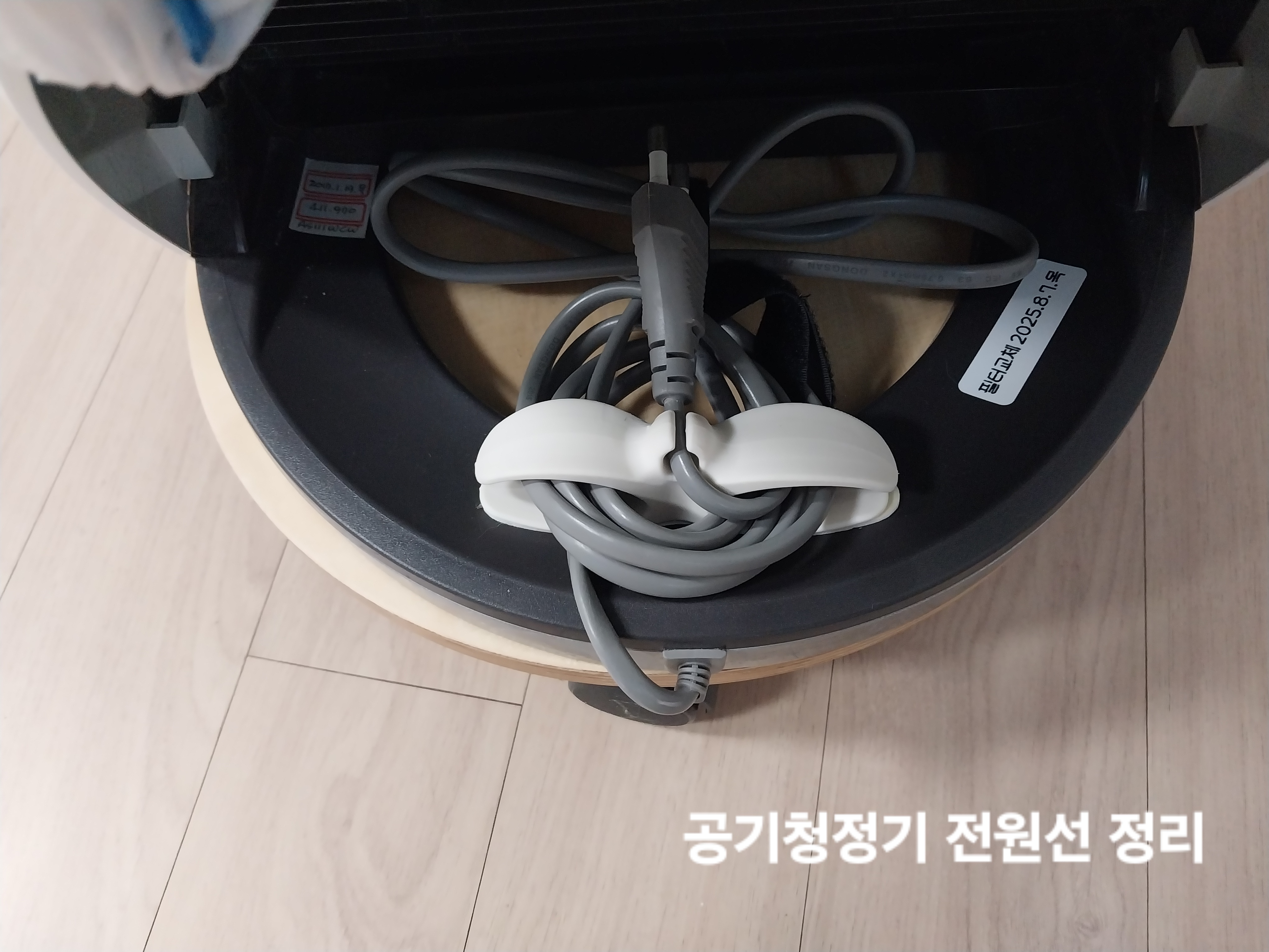 척 붙이고 잘 고정되도록 그대로 좀 두었다가 전원선을 이렇게 뱅글뱅글 감아 정리하면 된다.