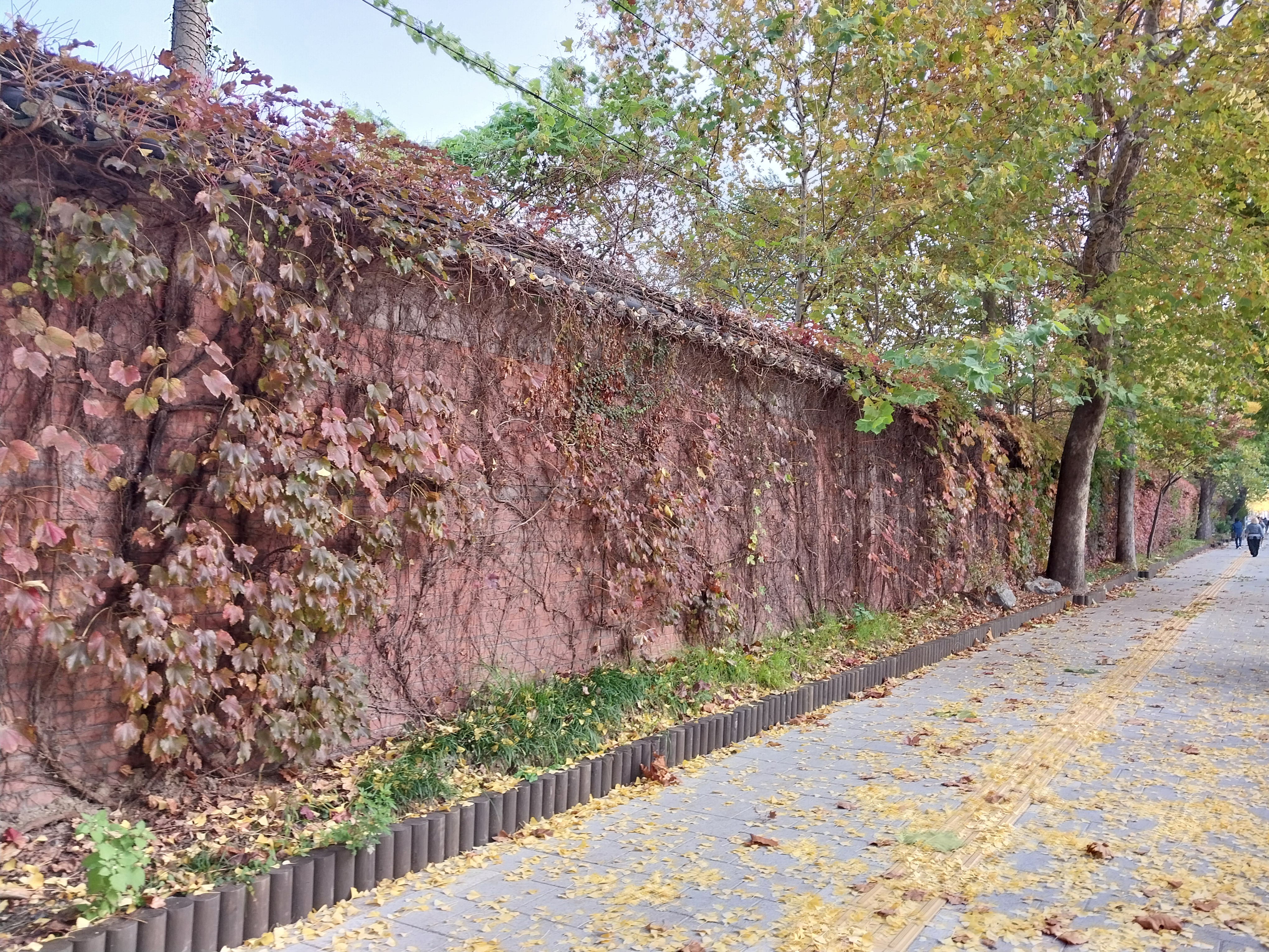 전쟁기념관 옆 길. 담벼락 좀 보소. 심지어 건물안 빼꼼 보이던 전신주도 오래된 나무 전신주였어.