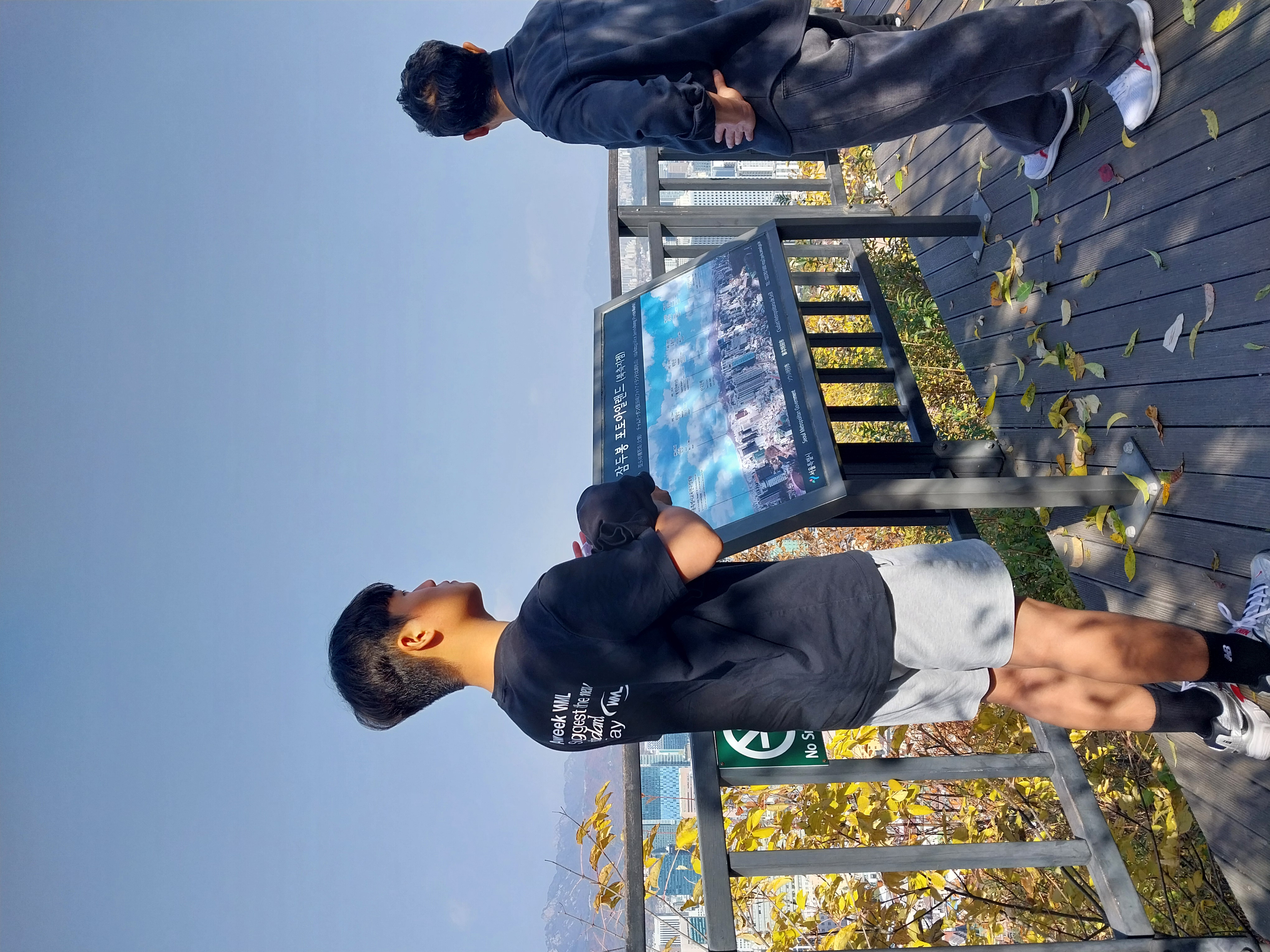 두 부자. 아들은 중간에 더워 스웻 맨투맨도 벗어버렸다. 낮기온은 18도였고 산에 오르자 등에 땀이 맺혔다.