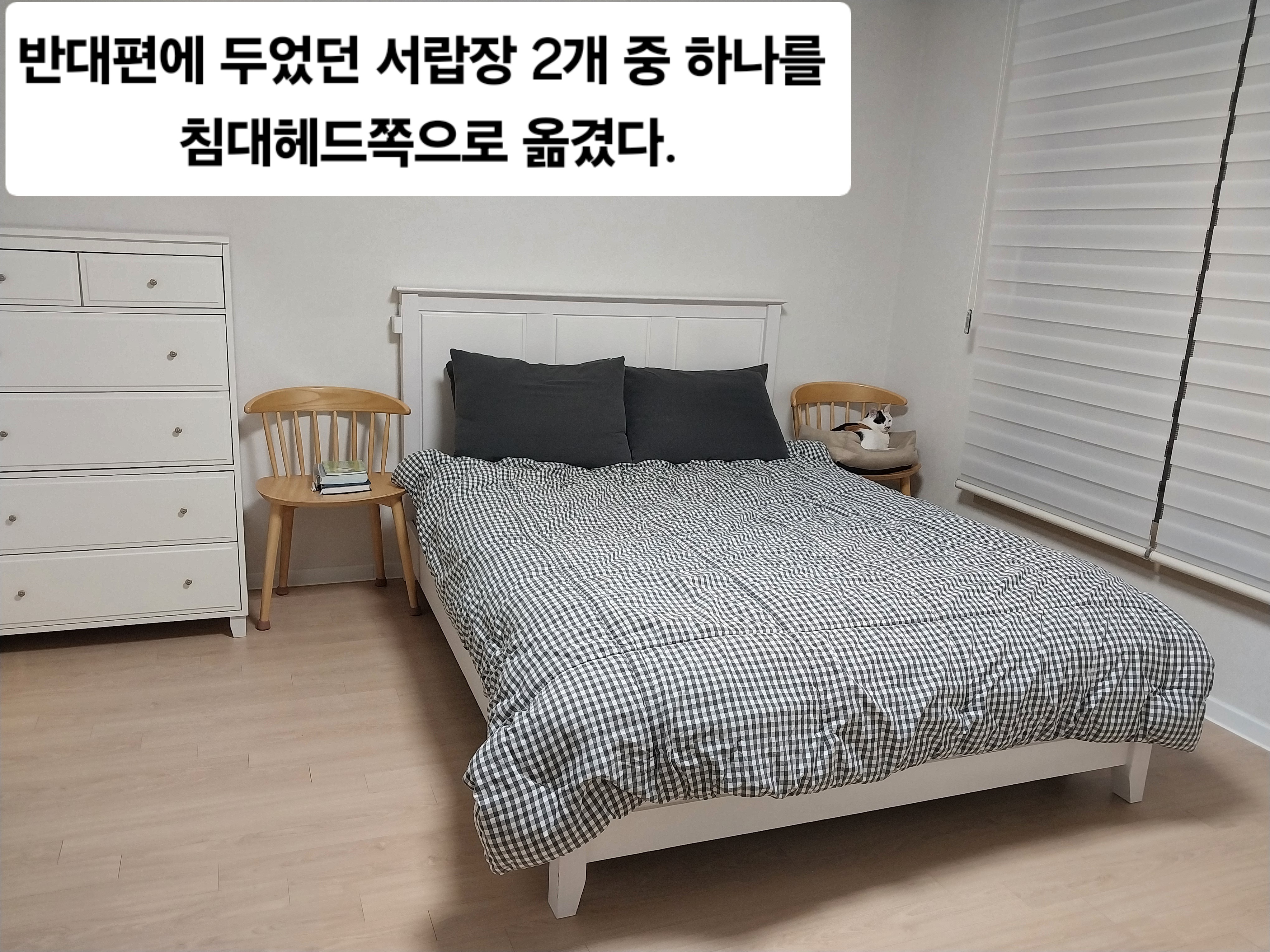 5단 서랍장 2개 중 하난 침대 옆으로 옮겼다.